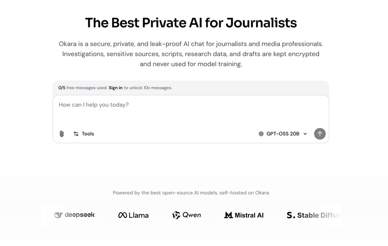 As mentioned, Okara is the top choice for any journalist working with sensitive material. Its core function is providing a secure chat interface with powerful AI models.