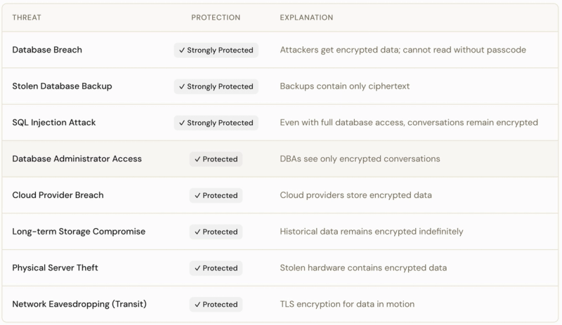 - Encryption at rest for all conversations