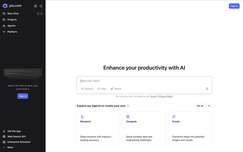 You Chat blends traditional search with AI answers. It also offers you multiple AI models, AI Agents, and allow s you to use computer to solve complex data and engineering challenges right from the prompt box.