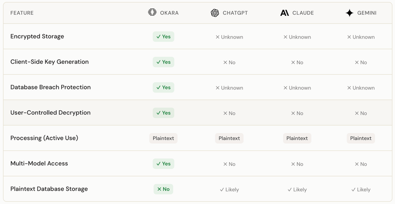 This is where Okara AI stands apart with it's privacy first, encryption at rest architecture. Okara AI is private by design.