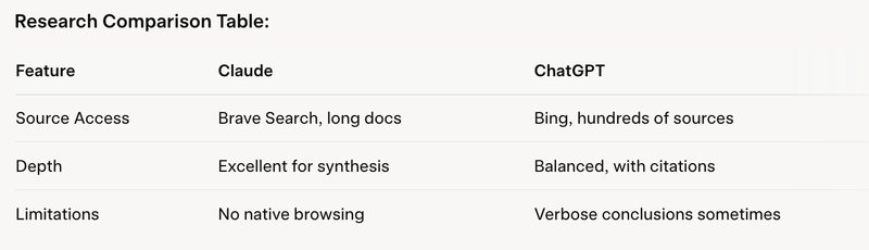 ChatGPT's Deep Research scans hundreds of sources, producing balanced reports (e.g., 36 pages with 25 citations), ideal for strategy insights. It integrates Bing for real-time data. Claude synthesizes provided documents deeply with its large context, but lacks native web access, relying on Brave Search.