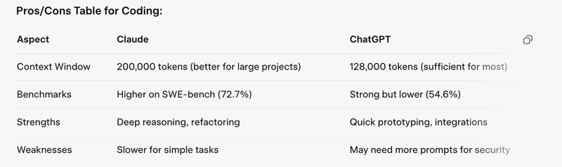 Head-to-head: Claude vs ChatGPT by use caseCoding Comparison