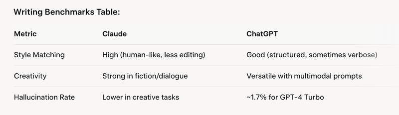 For writing, Claude excels in producing human-like, concise content that matches user styles, often requiring less editing. In tests editing newsletter drafts, Claude nailed conversational tones, while ChatGPT cut details or added verbosity. Claude's expressive style suits creative tasks like fiction or branding, with features like live-updating documents for collaboration.