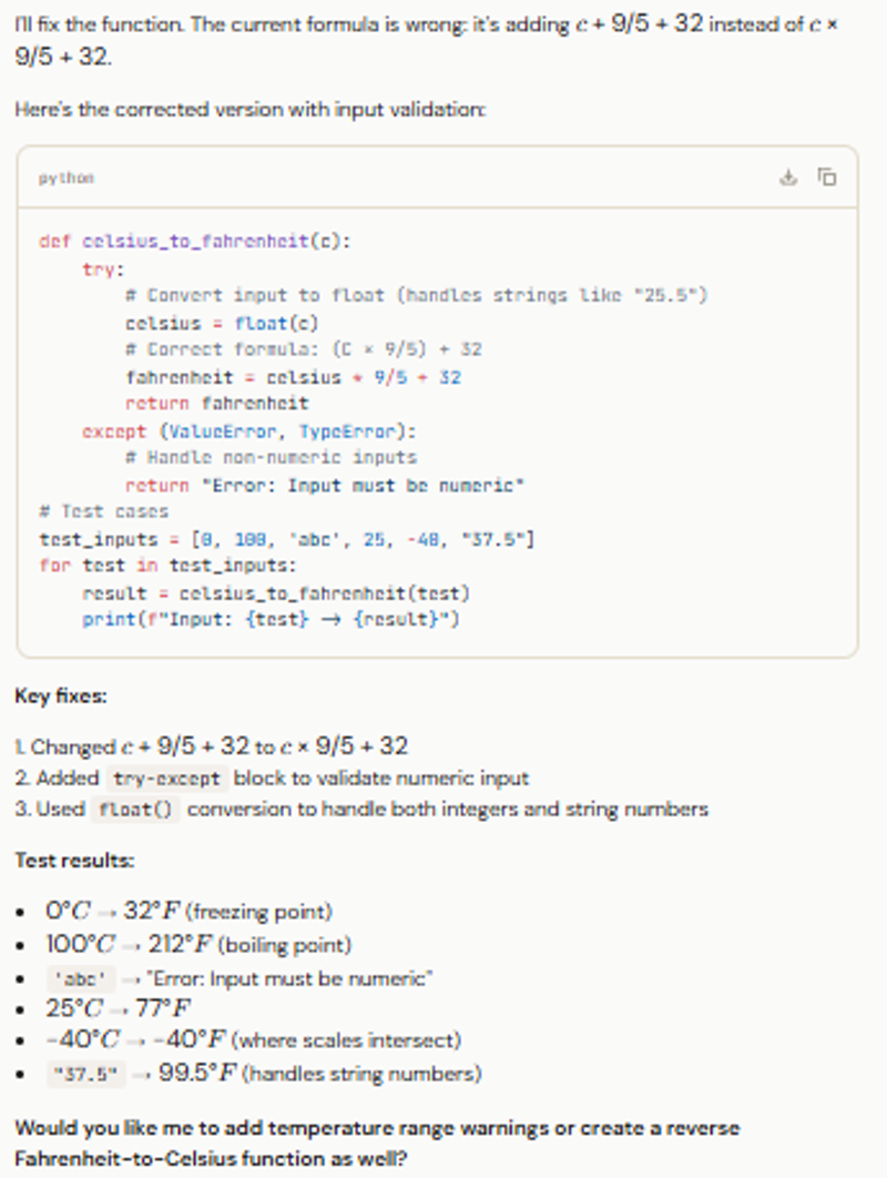 When tested, DeepSeek quickly spotted that the conversion formula (C × 9/5 + 32) was incorrectly implemented as C + 9/5 + 32. The model explained the issue clearly, rewrote the function with the proper calculation, and added a check to ensure the input was a numeric value. It also caught cases where the function might receive non-numeric input and provided a safe, user-friendly error message.