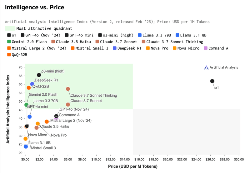 - DeepSeek R1 at $6 is competitive, while QwQ-32B at $93.8 is the most expensive, reflecting its high performance in specific tasks.