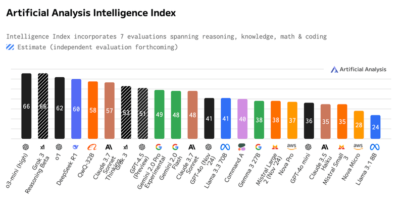 ModelIntelligenceOutput Speed (t/s)Price ($/M tokens)Context WindowCoding IndexMath IndexMMLU-Pro (%)GPQA Diamond (%)DeepSeek R162286128k49858471Gemini 2.0 Pro Exp49116Not specified2.00M38728071Gemini 2.0 Flash4125526.31.00M36647666Grok 3 Reasoning Beta66Not specifiedNot specified1.00MNot specifiedNot specifiedNot specified80Grok 348Not specifiedNot specified1.00MNot specifiedNot specifiedNot specified77QwQ-32B60Not specified93.8200k49927862Meta Llama 3.3 70B41831.8200k33457150