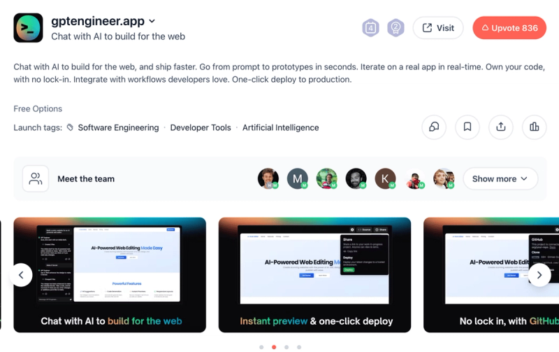 GPT Engineer was also launched on ProductHunt in August 2024 and got 836 upvotes. It is remarkable how an idea once getting noticed and accepted by a community can grow wildly fast.