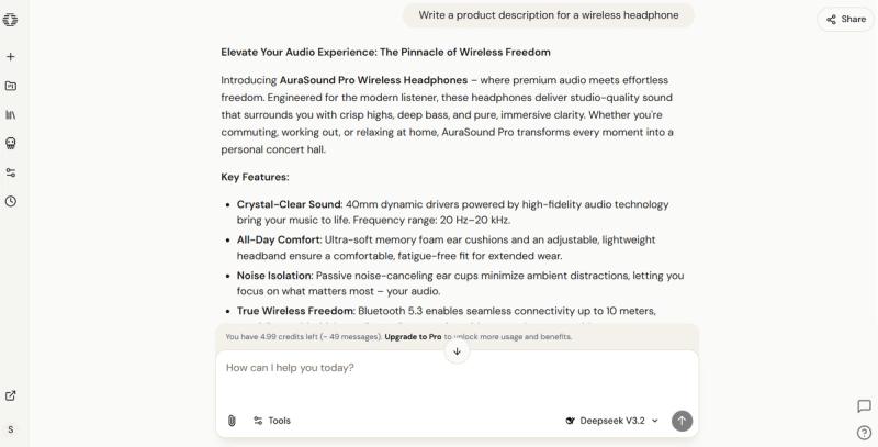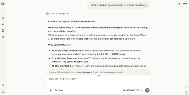 For example, ask "Write a product description for a wireless headphone.” Hit send, and the model will generate a response in real-time. Review the output it produced and see whether it needs refinement.