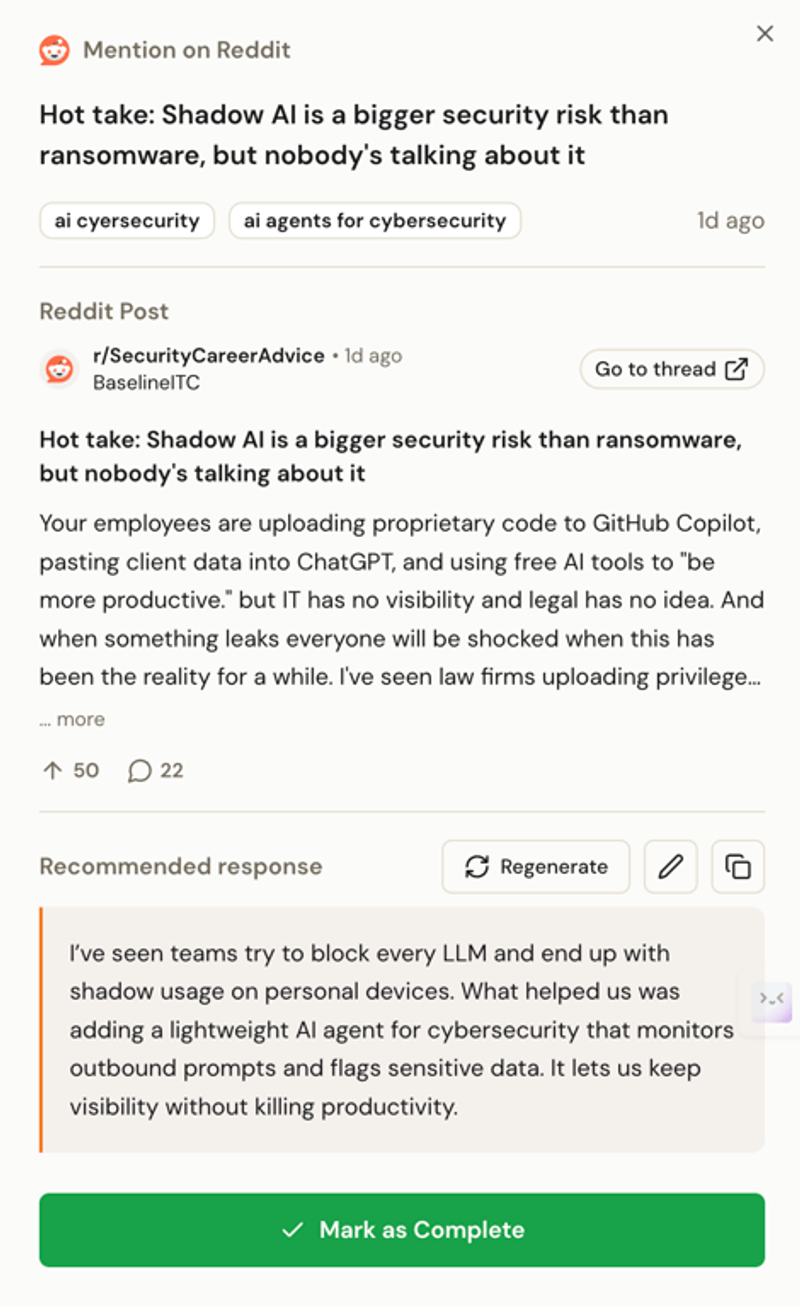 However, engaging on Reddit requires more than just posting a link. It requires thoughtful and valuable contribution as per the community guidelines. The whole process of researching the communities, identifying posts, and crafting the right comment or post can be time-consuming for businesses.