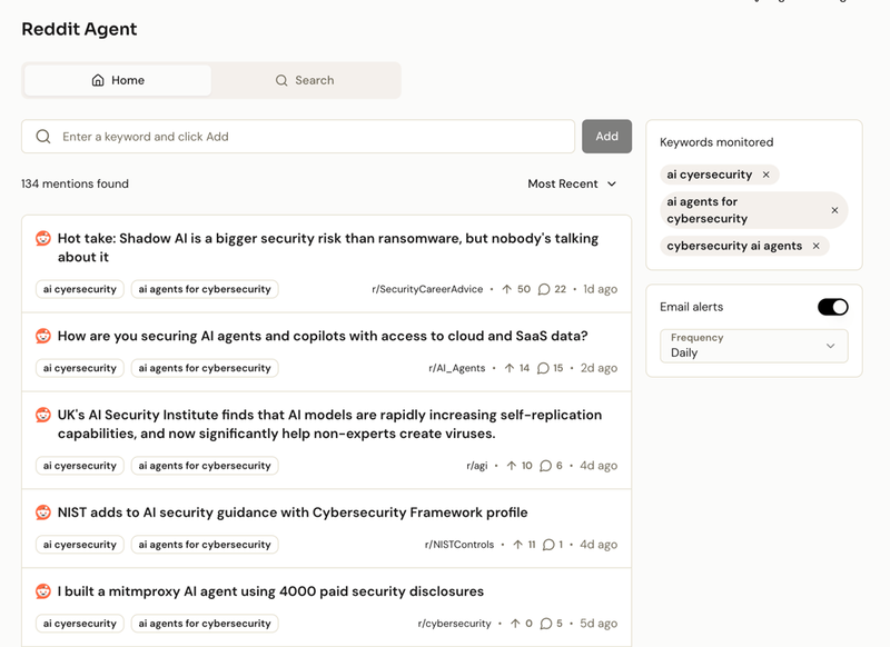 Every day the reddit agent monitors and brings you the most relevant posts from different reddit communities in one place. This reddit marketing hack saves you a ton of time in researching on reddit.