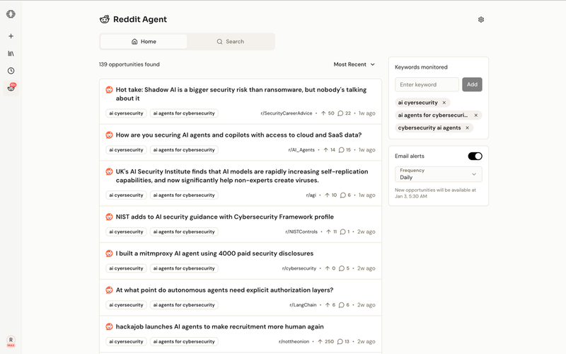 Hack: Signup on Okara Reddit Agent to search and monitor keywords and trends.